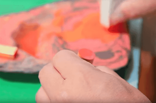 朱打ち - 粗彫りを行う際、筆書きした文字の線を判りやすくする為に朱色の墨を印面に均等に塗ります。